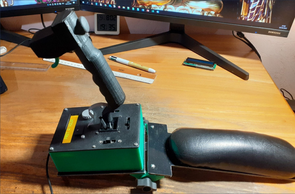 La question : Quoi faire d’une vieille télécommande destinée à la déchèterie si ce n’est de récupérer un des deux joysticks et d'en faire quelque chose d’adapté au pilotage d'une seule main, voilà donc un « Mono-Manche ». |