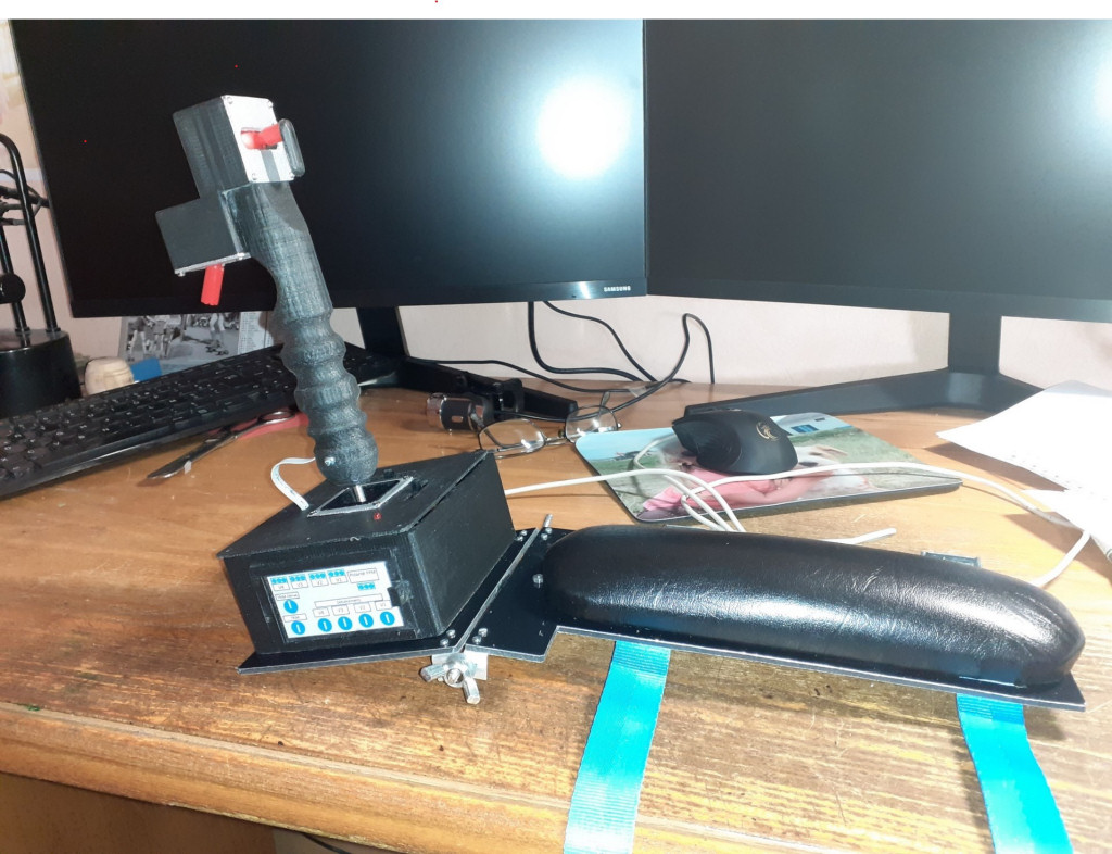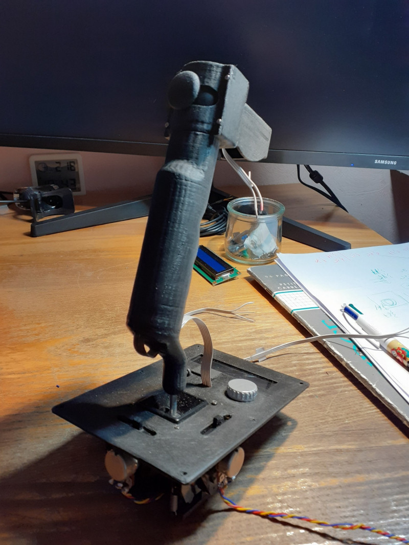 La question : Quoi faire d’une vieille télécommande destinée à la déchèterie si ce n’est de récupérer un des deux joysticks et d'en faire quelque chose d’adapté au pilotage d'une seule main, voilà donc un « Mono-Manche ». |