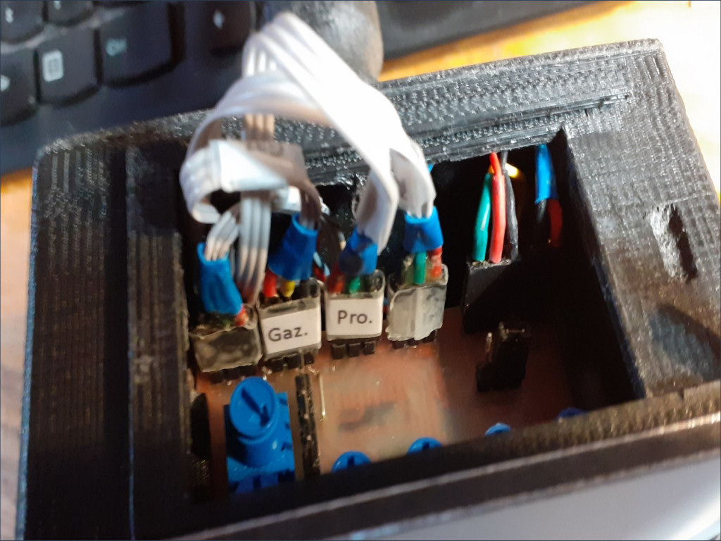 Une première version est élaborée, elle se veut simple, comme à l’ancienne pas de programmation : les débattements et les neutres avec des potentiomètres, le sens des voies et leurs attributions avec des connecteurs.